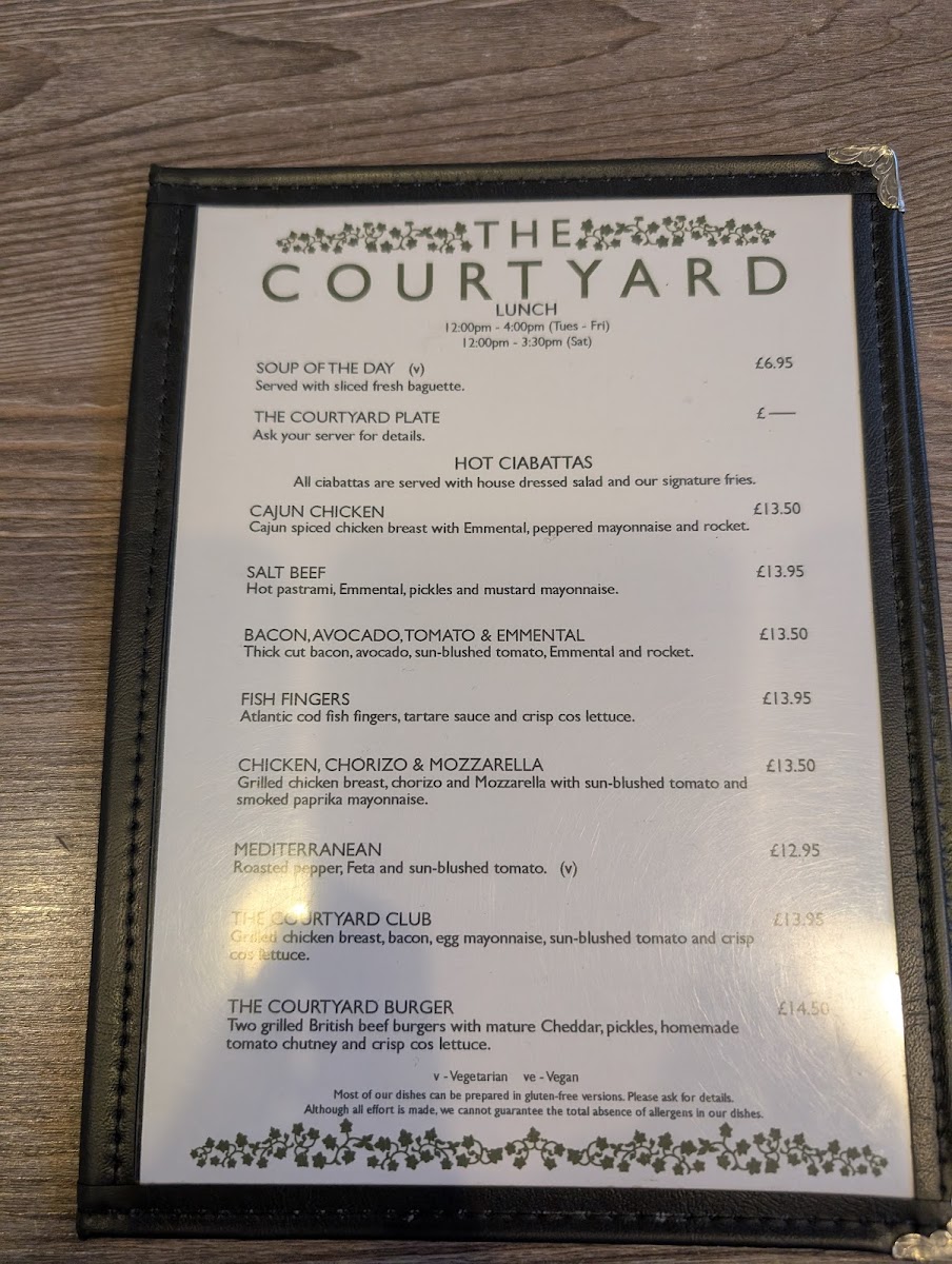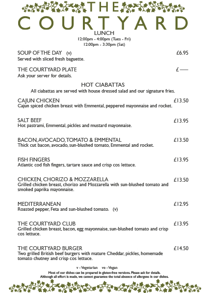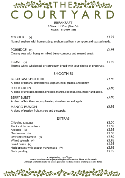 Welcome to The Courtyard, a delightful café nestled in the charming surroundings of Sunninghill, Ascot. This welcoming spot offers a diverse and enticing menu designed to please any palate. Start your day with a hearty The Courtyard Breakfast, featuring options like poached eggs on avocado or a classic bacon sandwich, perfect to fuel your morning adventures. For lunch, discover their freshly crafted salads, including the vibrant The Courtyard Salad and the rich Chicken & Bacon Caesar.